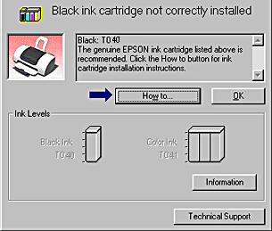 When the ink runs low or out, a How to button appears below the text box. Click How To and EPSON Status Monitor 3 will lead you step-by-step through the cartridge replacement procedure.