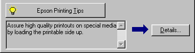Tips for getting the most out of your EPSON printer software appear in the text box at the bottom of the Progress Meter window. A new tip appears every 30 seconds. For more details on the tip which is currently displayed, click Details.