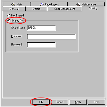 Select Shared As, then type the printer information as required and click OK.