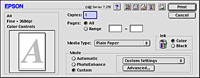 ![]() | Select Custom as the Mode setting in the Print dialog box. This enables the Custom Settings list, located to the right of the Custom radio button. |