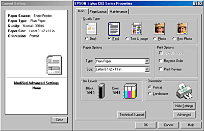 Under Quality Type on the Main menu, five levels of control over the printer software are available.