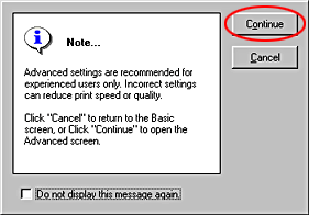 ![]() | Click Advanced on the Main menu. If the Note window as following appears, click Continue. The Advanced menu appears. |