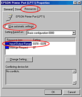 ![]() | Click the Resources tab, then clear the Use automatic settings check box. Write down the Input/Output Range settings shown in the resource settings box. |