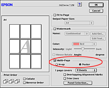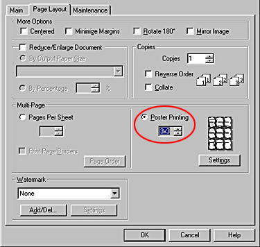 ![]() | Select the Poster Printing option under Multi-Page on the Page Layout menu, and then click the up or down arrow to select 2x2, 3x3 or 4x4. |