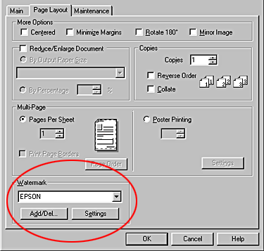 For Macintosh, select the Watermark check box in the Layout dialog box, and then select the desired watermark from the Name list.