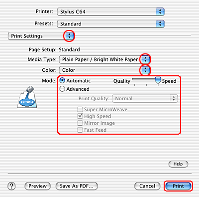 Make the appropriate Media Type, Color, and Mode settings.