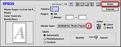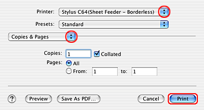 Select Stylus C64 (Sheet Feeder - Borderless) as the Print setting, then make the Copies & Pages settings.