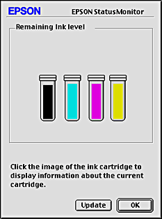 | If any one of the ink cartridges that are installed in the printer is broken, incompatible to the printer model, or is installed improperly, the EPSON Status Monitor 3 will not display an accurate calculation for the amount of ink remaining in any of the ink cartridges. Be sure to replace or reinstall any ink cartridge when indicated by the Epson Status Monitor 3. |