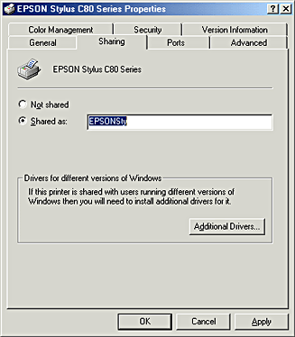 If you want Windows 2000 or NT 4.0 to automatically download printer drivers to computers that are running different versions of Windows, click Additional Drivers and select the environment and the operating systems for the other computers. Click OK, then insert the printer software CD in the CD-ROM drive. Select WINNT40 for Windows NT4.0 or WIN9X for Windows Me, 98 or 95. Click OK to install the additional drivers.