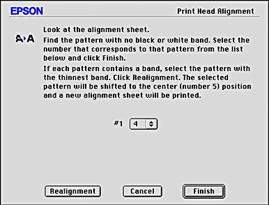 Look for a pattern that does not contain any black or white banding. Next, find the corresponding pattern number from the drop-down list box in the Print Head Alignment dialog box. Click Finish to enable the adjustment.