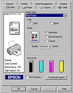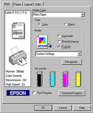 When you select a custom setting, other settings such as Print Quality, Halftoning, and Color Adjustment are made automatically. Changes to these settings are reflected in the display at the left side of the Main menu.