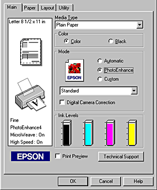 Selecting PhotoEnhance also enables the Digital Camera Correction check box. Select this check box when you are printing photos taken with a digital camera to give your printed images the smooth, natural appearance of photographs taken with a film camera.