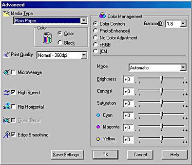 The settings in the Advanced dialog box give you complete control over your printing environment. Use these settings to experiment with new printing ideas or to fine-tune a range of print settings to meet your individual needs. Once you are satisfied with your new settings, you can give them a name and add them to the Custom Settings list on the Main menu.