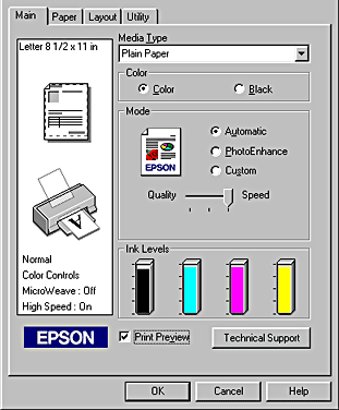 When you send a print job to the printer, the EPSON Print Preview window opens, allowing you to make changes before printing.