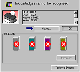 When the ink runs low or out, a How to button appears below the text box. Click How To and EPSON Status Monitor 3 will lead you step-by-step through the cartridge replacement procedure.