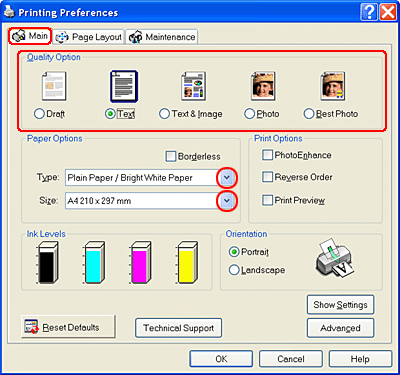 Click the Main tab, then make the Quality Option setting. See the following section for details on the Quality Option settings.