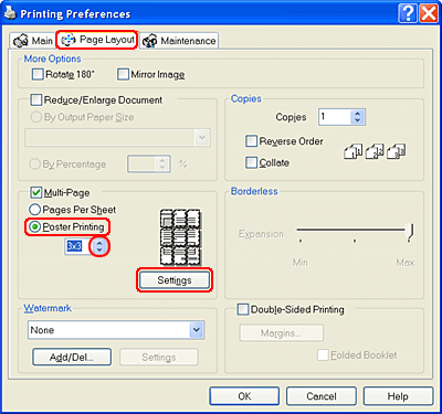 Click the Page Layout tab, select Multi-Page, then select Poster Printing. Click the up or down arrow to select 2x2, 3x3, or 4x4.