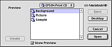 The above example uses an image that is included in the EPSON Print CD. When using images taken with digital cameras and saved on your computer, do not click Edit Background tab, but click File to select the folder that contains the images you want to use.