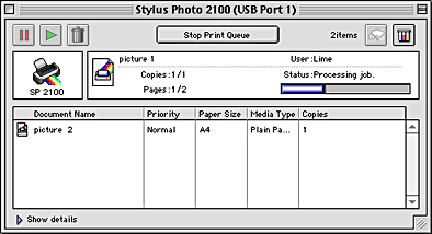Your print document is not displayed on the Printer Manager (above figure) if the print job has already been sent to the printer. In that case, you can stop printing by turning off the printer.