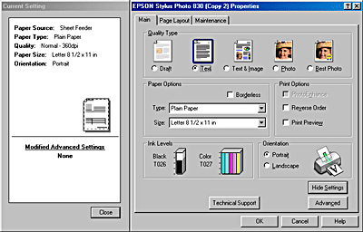 Under Quality Type on the Main menu, five levels of control over the printer software are available.