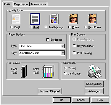 You can make Quality Type, Paper Options, Print Options, Orientation and Advanced settings and check the Ink Levels on the Main menu. Refer to the appropriate section below.