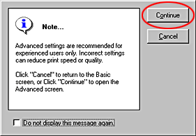![]() | Click Advanced on the Main menu. If the Note window as following appears, click Continue.The Advanced menu appears. |