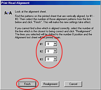 From each pattern on the printed test sheet, choose the vertical line that is aligned best. For each pattern, select the corresponding line number from the appropriate drop-down list box in the Print Head Alignment dialog box, then click Finish to put the new settings into effect.