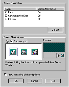 Click this button to open the Monitoring Preferences dialog box, where you can make settings for EPSON Status Monitor 3.