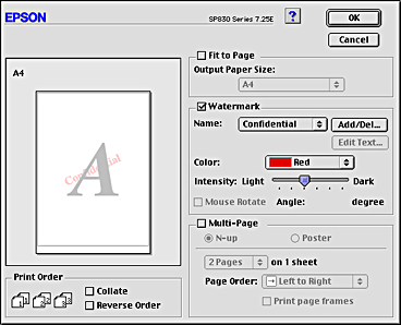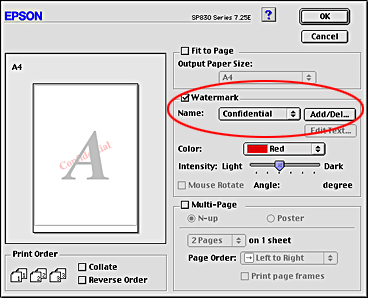 ![]() | For Windows, select the desired watermark from the Watermark list on the Page Layout menu, and then click Settings. |