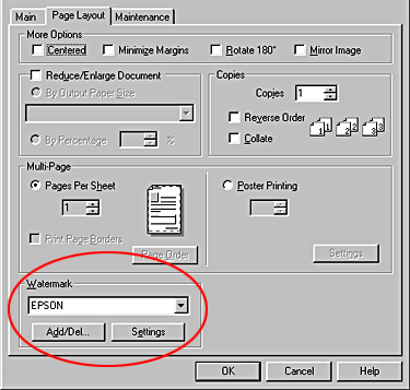 For Macintosh, select the Watermark check box in the Layout dialog box, and then select the desired watermark from the Name list.