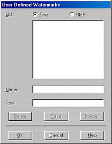 ![]() | To use an image file as a watermark, select BMP. Click Browse to specify the bitmap file you want to use, and then click OK. Type a name for your watermark in the Name text box, and then click Save. |
