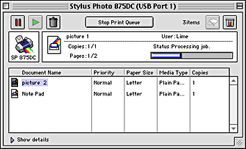 ![]() | Click the name of the document which is printing in the Document Name list, then click the Stop icon button to cancel the print job. |