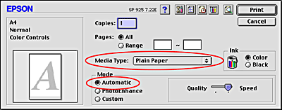Select Plain Paper as the Media Type setting, and Automatic as the Mode setting.