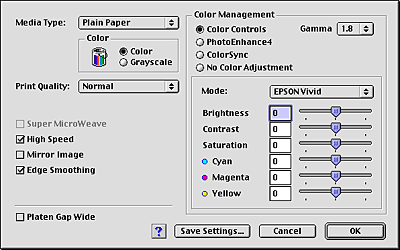 EPSON Standard: Provides output that closely matches the original data. Charts and Graphs: Intensifies the colors and lightens the midtones and highlights of an image. Use this setting for presentation graphics, such as charts and graphs. EPSON Vivid: Based on your data, enhances color balance for optimum print results. This setting is recommended for most print jobs. |