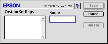 Type a unique name for your settings in the Name text box, then click Save. The name can contain a total of up to 16 letters and numerals. You can also use up to eight, double-byte characters; however, they may not be displayed correctly on the screen depending on your operating system settings. Your custom setting will be added to the Custom Settings list, and the latest custom setting will be selected. You can save up to 100 custom settings.
