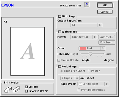 Prints a text or image as a watermark on your printout. |