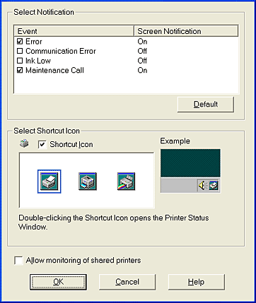 Select the Shortcut Icon check box and choose an icon type to have a shortcut icon placed in your Windows taskbar. You can click the shortcut icon in the taskbar to open EPSON Status Monitor 3 or right-click the icon to access some of the printer utilities. |
