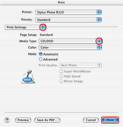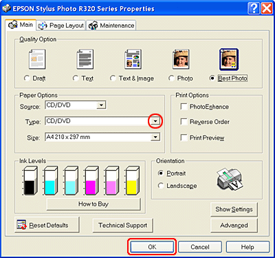 Make sure that Stylus Photo R320 is selected as the Printer setting.