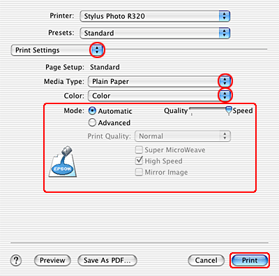 ![]() | Select Stylus Photo R320 as the Printer setting, then make the Copies & Pages settings. |