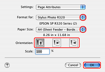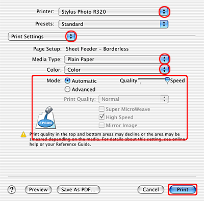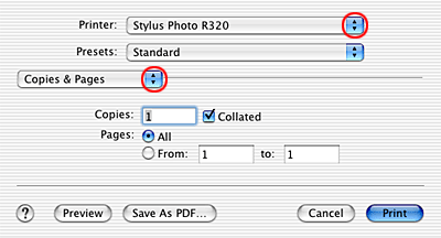 Select Stylus Photo R320 as the Print setting, then make the Copies & Pages settings.