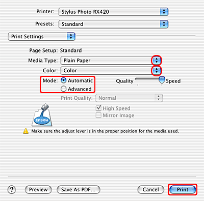 Make the appropriate Media Type, Color, and Mode settings. See online help for details of Print Settings.
