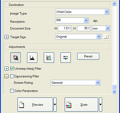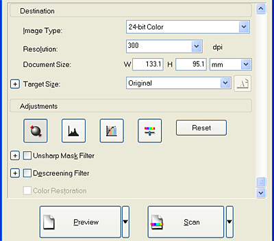 ![]() | Use Target Size to specify the output size of the scanned images and then specify the Adjustments settings, if necessary. See Creating Beautiful Reproductions for details. |