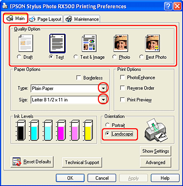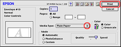 ![]() | Select Stylus Photo RX500 as the Printer setting, then make the Copies & Pages settings. |