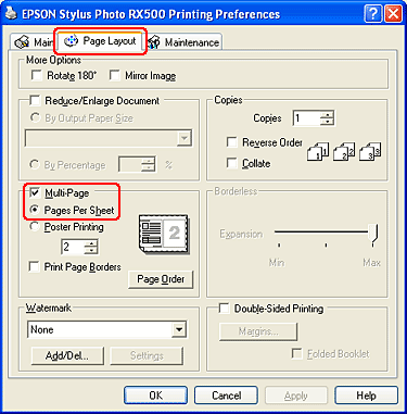 ![]() | Click the Page Layout tab and select the Multi Page check box. Then, select Pages Per Sheet. |