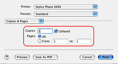 ![]() | Select Stylus Photo RX600 as the Printer setting, then make the Copies & Pages settings. |