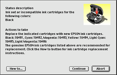 When the ink runs low or out, a How to button appears below the text box. Click How to, and EPSON Status Monitor 3 will lead you step-by-step through the cartridge replacement procedure.