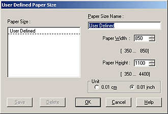 Select User Defined as the Size setting. The User Defined Paper Size dialog appears.