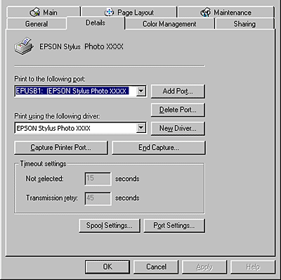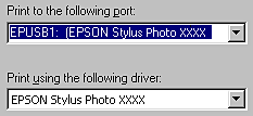 If EPUSBX: (EPSON Stylus Photo RX600) is displayed in the Print to the following port list box, then the USB printer device driver and printer software is installed correctly. If the correct port is not displayed, proceed to the next step.