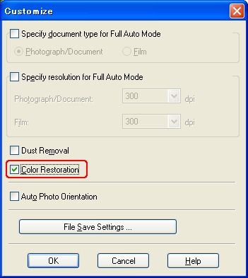 Full Auto Mode: Click the Customize button. Then click the Color Restoration checkbox and click OK. Continue with step 9.