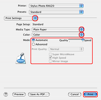Make the appropriate Media Type, Color, and Mode settings. See online help for details of Print Settings.